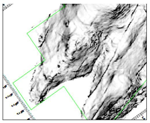 Figura 1 Reflexão da coluna de colapso no atributo de amplitude (esquerda) e atributo coerente do corpo (direita)